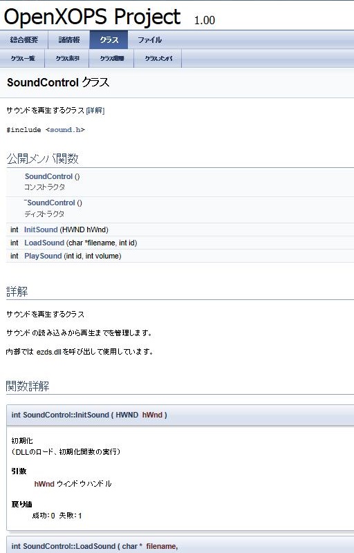 本当に長くブログを放置してしまって、すいません。 前々から話している「OpenXOPS」のプロジェクトについて、検討の最終段階として 実際に模擬的な開発をやっています。 (クリックで拡大) 4年前の「偽XOPS」の記憶を取り戻したり、ある程度信用できる開発工数・時間を見積 もるためにやっていましたが、気が付くと本番に流用できるレベルのものになっていし まいました。 合計作業時間は40時間ほどです。 外見だけだとまだまだですが、内部では描画周りを中心に、ごく一部を除き一通り実装 してしまいました。本家XOPS作者のお二人には失礼で申し訳ないですが、現行XOPSの 描画周りは特別難しい技術は使われておらず、ごく一部分を除き概ね簡単です。 さらに言えば、この程度の描画処理を行えない(書けない)レベルだと、ゲームとして XOPSを作るのは不可能です。 OpenXOPSで最も難しいと推測されるのはAI周りで、次は当たり判定全般です。 この2点は、現状XOPS界で解析作業が殆ど行われてないにも関わらず、ゲームバランス を決める極めて重要な部分です。本家XOPSを再現する上で、決して手を抜くことができ ず、気を緩めることが出来ない部分になります。おそらく、このAIと当たり判定は最後 まで苦線を強いられ、地道な改良作業が続くでしょう。 なお、現状はAI周りや当たり判定の具体的な処理まで、やっていません。 あと、もう一つ。外せない重要な要素があります。 Doxygen(ドキシジェン)を活用した、ドキュメント作成です。 (クリックで拡大) ソースコードをオープンソースで公開し、加えて他の方々に利用してもらうことを考える と、見やすいソースコードを書くことはもちろんのこと、ドキュメントの整備も必須です。 ソースコードを書き換えるたびに別途ドキュメントを書き直すのは、手間で苦痛以外何物 でもありません。 Doxygenを利用すれば、ソースコード内に書かれた特定の書式に合わせたコメントを自動 認識して、ドキュメントを自動生成してくれます。VC++のビルド設定に自動的に実行す るように仕込んでおけば、もう完璧です。 Doxygen自体は殆ど触ったことなく、今回ぶっつけ本番で実戦投入しました。独特(?) のコメント記述スタイルに慣れるのが大変でしたが、一度慣れればとても便利です。 OpenXOPSに限らず、今後ある程度規模の大きいソフトウェアを組む時は、率先して使う べきかと迷うレベルです。 あー、完全にやり過ぎましたね。。 あとは、AIと当たり判定周りを試してみて、ある程度見積もりが取れ次第 一度作業を 中断し、再検討する作業に入ります。 ※決して、正式にOpenXOPSの開発が始まったわけではありません。