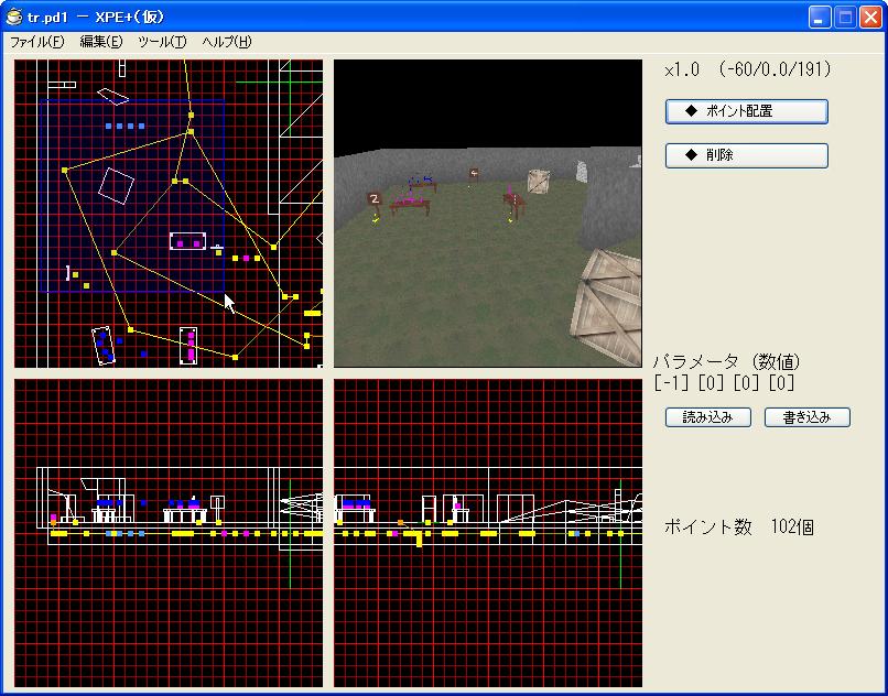 「ポイントエディタ」の開発ですが、なんとか複数選択っぽいものが出来ました。 青い枠も気合いで出した。 でも、3つ以上選択した状態で(3つまとめて)移動しようとすると、 なぜかバグが起きるのは泣き所。 完成は程遠い・・。