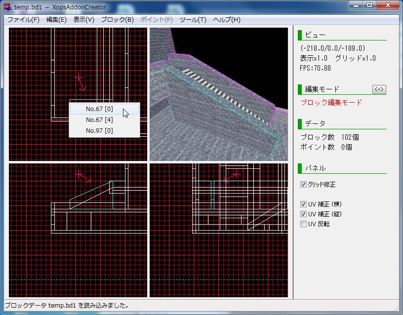 最近は熱心に自分の部屋を片付けています。 実質 物置部屋だった場所を改装していくのは大変なことです。 ちょっと前に、ようやくエアコンが付きました。 でも空調を使わない我慢生活に慣れてしまったせいか、全然使って ません (え 最近XOPSサーチエンジンが重いですよね。どうやらサーバー自体 が重いらしいです。 無料で借りてるのであまり文句は言えないのですが、ここままだと ちょっとサーバー移転も考えたほうが良いでしょか・・。 本題のXopsAddonCreatorですが、最終段階のここにきて新機能 追加です。 (クリックで拡大) ブロックの頂点を1個から選択できます。 表示されるメニュー項目が分かりにくい(ってより、必要な情報が 分からない)ので、メニューにマウスカーソルを選択すると、対象 の頂点を含んだブロックを2Dビューと3Dビュー共に水色で表示 します。 過去に自分の掲示板にて『「重なった頂点の個別選択」というのは 何かしら実現する予定です。』っと公言したまま忘れてました。 その通りの機能になりましたが、当初の懸念通りインターフェース が難しいです。 ソフトウェアの操作性の設計というのは難しいですね。 後は、直接の知人から指摘されたベンチマーク機能の追加と、タスク バー周りのバグを修正したいと思います。