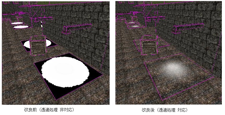 自分で決めた人生の選択について、果たして正しい判断だったのか 考え込んでしまうのですが、某氏とメールで話している時に、 『未来の事は分かりませんし、どの選択がより良かったのかは 未来になっても分からない事だと思います』 と言われ、なんか納得してしまいました。 さてさて、XopsAddonCreatorの開発ですが、コツコツとバグ潰し をしつつ、改良を重ねています。 ここ数日で行った大きな改良は、ブロックテクスチャの透過処理に 対応させたことです。 (クリックで拡大) ※ マップは「Korean Zombie Mode 1.84 (Multiplayer)」に収録 されているものをお借りしています。 画像を見ての通りですが、現行バージョン(画像・左)はテクスチャ の透過処理に対応していないため、うまく処理されず、意図しない 悲惨な描画になってしまいます。 今回の改良(右)によって、より本家・XOPSの動作に近い自然な 描画がされるようになりました。 画像でお借りしたマップは、照明の下が明るくなっているのを透過 処理を行ったテクスチャ(PNG形式)で再現しているのですが、 今回の改良で綺麗に表示されるようになりました。 ってか、現行バージョンの表示が酷過ぎますね。よくこんな仕様で どっからも苦情がこなかったな~ とか思ってしまいます。 なんか久しぶりにブログに画像を貼った気がするのですが、どうも 2ヶ月ほど前に、開発ネタで動作速度の比較グラフを貼っていました。 やっぱり画像貼ると華やかで良いですね。今後はもっと色々な画像を 貼っていこうかなぁ。