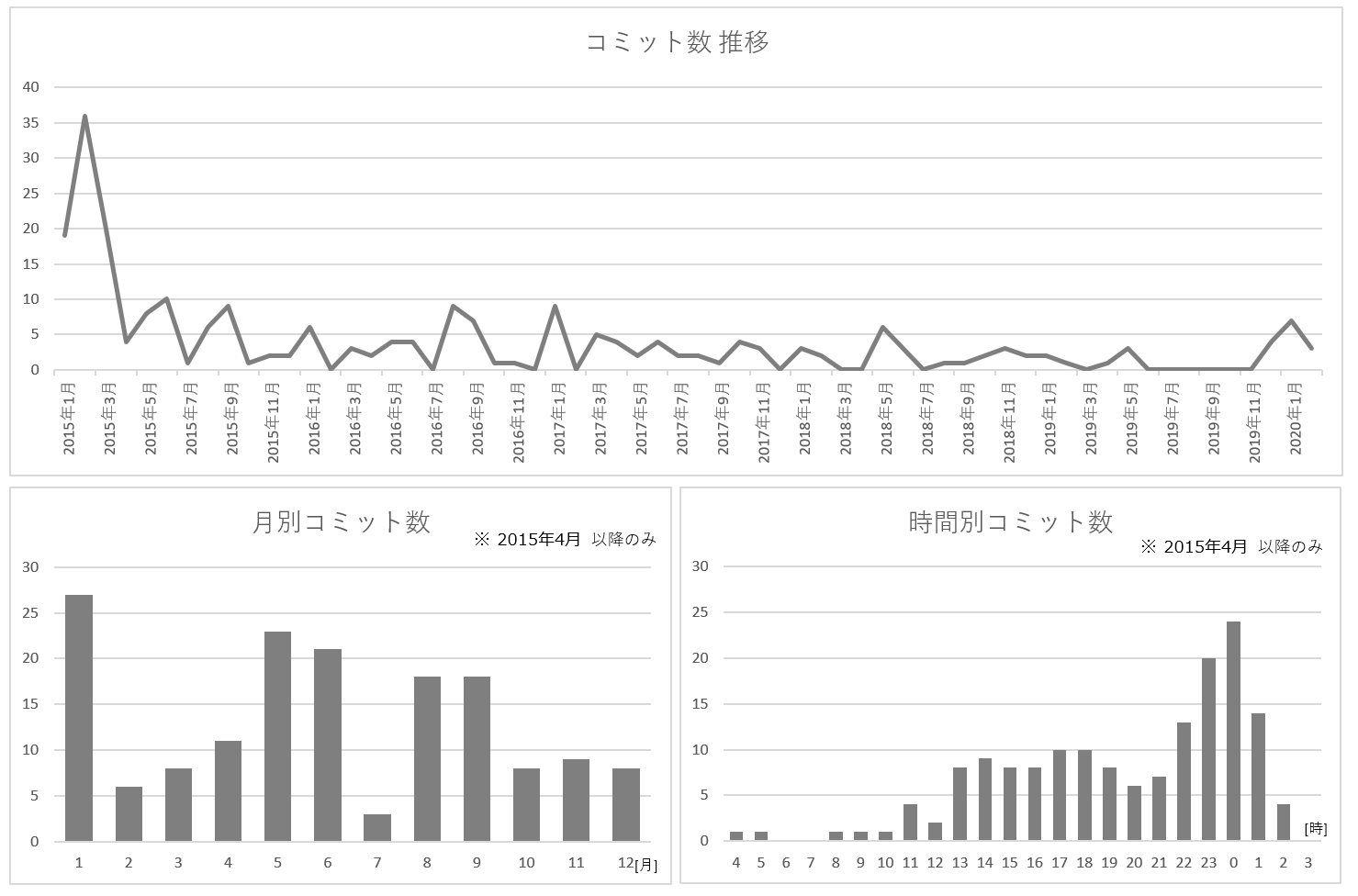 OpenXOPSを開発しまくっている [-_-;](みかん) です。 前振りの通りで、最近はOpenXOPSの開発に勤しんでいます。 もうレベル上げに必死な状況です。 やばい、OpenXOPS 超たのしぃ~。 本流のOpenXOPSに加えて、yosi-mikan Conceptほか派生系のプロジェクト を色々やっていました。 特に派生系でやっていることについては、一部のネタは仕上がってきたので、 そろそろ出したいですね。・・・・こりゃみんな驚くぞ(^^ 表題の件ですが、この度は「数字で見るOpenXOPSの開発状況」と題して、 OpenXOPSの開発がいかにして進んでいるのかお見せしようと思います。 とは言っても、そんなに難しいことをやるわけではなくて、OSDNにある OpenXOPSプロジェクトページにおけるコミット(言わばソースコード の細かいアップデート)状況を大雑把にまとめただけです。 OpenXOPS Wiki - OSDN https://ja.osdn.net/users/xops-mikan/pf/OpenXOPS/wiki/FrontPage 以下のグラフは、本記事投稿時点における、コミットの推移や月別・時間別 の集計です。 (クリックで拡大) ぱっと見るだけでもかなり面白いのですが、解説してみます。 皆さんも画像を見ながら続きを読むと、面白いと思います。
