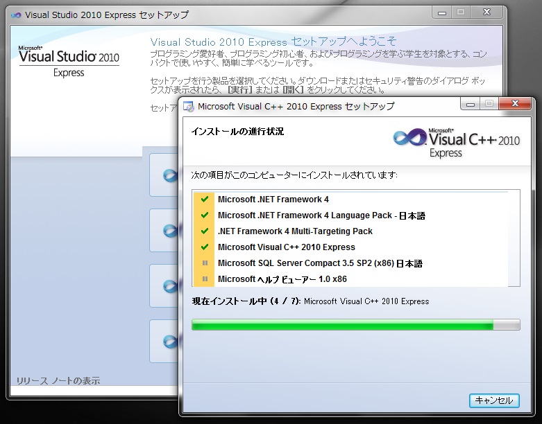 Microsoft Visual C++ 2010 Express Edition(以下:VC++2010)を インストールしようとしたものの、インストーラーが途中で進まなくなる 現象に遭遇しました。 結論から言うと、Windows Updateを修復することで直ったのですが、 現象の発生から原因特定、その解決方法まで 一部始終を記録して おきます。 PC自体は、知人から壊れた状態のまま安く買い取り、自分で直した ものです。これといった用途は無く、日頃は寝ています。 OSはWindows 7 Professional SP1の32bitです。 VC++2010のインストールには、オフライン・DVD版のインストール を使用しました。わざわざDVDを作るのが面倒だったので、入手した isoファイルをVirtual CloneDriveで読み込ませています。 ・・・・想像以上に良いソフトだった。 VC++を選択しインストールを始めると、最初は快調なものの途中で 止まります。 (クリックで拡大) ステータスバーのアニメーションは動いており、インストーラーがフリ ーズしているわけではないのですが、数時間放置しても同じ場所から 全く動きません。