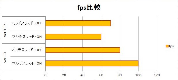 半年ぶりにこのタイトルで書きます。 別件でマルチスレッド処理を検討している時に、ふと現行のVer:1.0系の マルチスレッド周りの処理の改善案が思い浮かびました。 早速実装してみると・・・、これが大当たり! fpsが伸びなかったり、CPU負荷が増えたりと一癖あったマルチスレッド 処理が大幅に改善しました。 以下、実験結果です。 縦軸に「Ver:1.0b」というのが現行品、「ver:1.1」というのが今回開発 した改良型です。 横軸がfps数で、基本的に右に行くほど高速に動作していることを表します。 (クリックで拡大) 実験環境~ CPU:Core 2 Duo 3GHz、Memory:4GB(実質3GB)、 GPU:GeForce 9800 GT、OS:Windows7 32bit ブロック数0個 ポイント数0個 1920x1080のディスプレイに最大化表示 マルチスレッド周りを改良したにも関わらず、なぜかOFFに設定しシングル スレッドで動作させた場合にも改善が見られる理由は分かっていません。 なお、この環境は改良前後に関わらず、CPU負荷はOFFで50%、ONで80% ほどでした。 細かいデータは取っていませんが、PC(環境)によって特徴の出方が 異なるようです。他のPCでは、マルチスレッド時のfpsは大差ないもの の、改良前後でCPU負荷が半減する効果が出る場合も確認できました。 XopsAddonCreatorの次回バージョン(Ver:1.1?)から、この改良した マルチスレッド処理を導入する予定です。 ただし、公開時期などは未定です。 「他所を改良したら全体的に処理が重くなり、fps数の増加(改善)分が 帳消しに」ってこともあり得ますし、全ての環境で動作が改善することを 保証するつもりはありません。