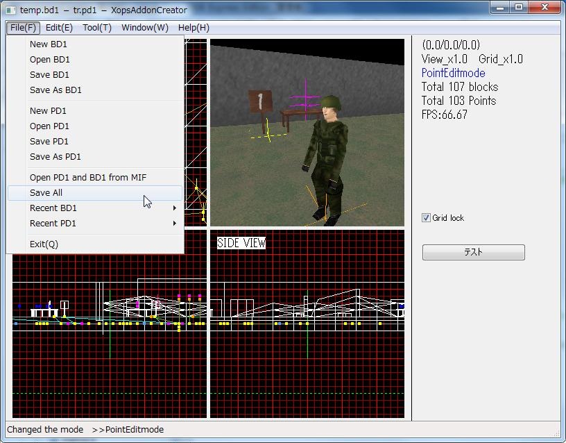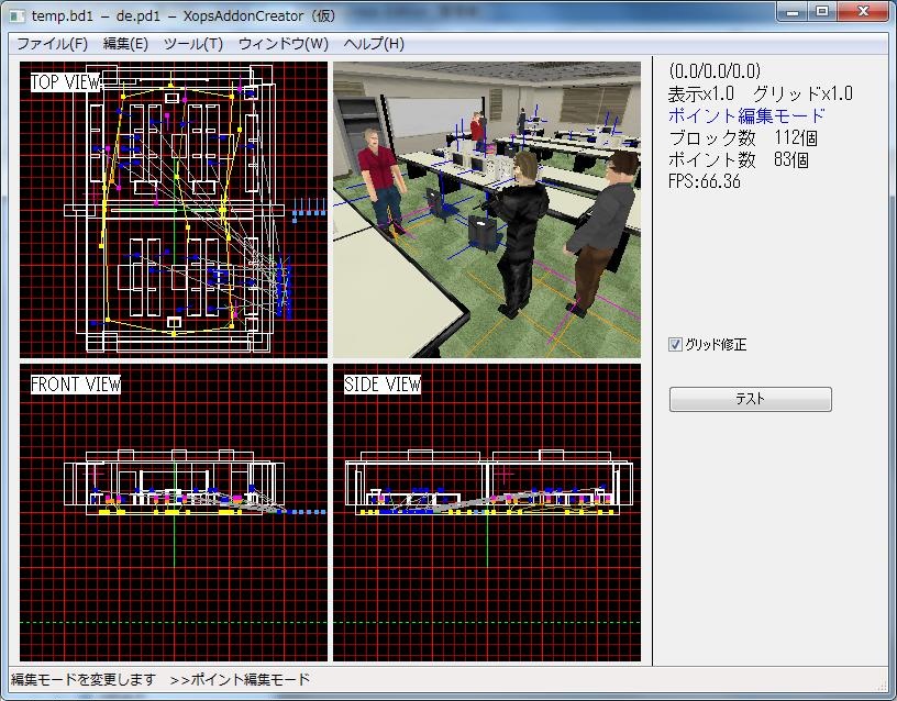 9月1日 あのソフトの次世代機つくろうとしてた 9月12日 あのソフトの次世代機 かな? 9月20日 グラフィック比較 11月10日 実質あのソフトの次世代機 今まで適当な名前で呼んできましたが、ソフトウェア名と開発を正式に発表します。 名前:『XopsAddonCreator』 (XPE+:ポイントエディタ と異なり、基本的に略しません。) 概要 ・現行ポイントエディタ「XPE+」の次世代ソフトウェア。 ・ブロック編集も行えるようにし、ADDON制作の総合環境を目指す。 ・現行XPE+より動作は軽い。近年のマルチコアCPUも意識した設計。 ・とりあえずWindows2000以降なら動く見込み。ただしDirectX 9.0c必須。 ・使用する開発環境も変更し、最初から制作し直す。 ・XOPS2については現時点で非対応。(正式発表されていない以上無理) ・多言語対応 ・公開時期未定。ってか開発続行すら未定。 機能 ・基本的に、現行XPE+の機能は全て取り込むつもり。(一部例外あり) ・操作性はXPE+より部分的に変わるかも。 ・前述の通りブロック編集モードを実装。 ・「元に戻す」機能実装 ・ウインドウはサイズ可変に。最大化も可能。 ・各ビューは表示サイズを変更可能。 以下、多言語動作のテストとして、今回は英語表示した画像。 (クリックで拡大) 独自形式(フォーマットとしては汎用のINIファイル)の「言語ファイル」を用意することで、 日本語、英語、韓国語、中国語、ロシア語・・・などUnicodeで表現できる言語ならば 何語でも表示できます。 ただし私の語学力の問題により、標準では日本語と英語のみの採用になりますが、 言語ファイルはユーザーで追加することも可能です。 付属する説明書としては、日本語で書かれたものをメインに用意する予定。 その他に、テキストファイルで書かれた簡易的な英語の説明書も用意しようかなぁと。 っと言っても、公開場所の「みかん箱」がバリバリ日本語なので、はたして外人が使って くれるかどうかは分かりませんが。
