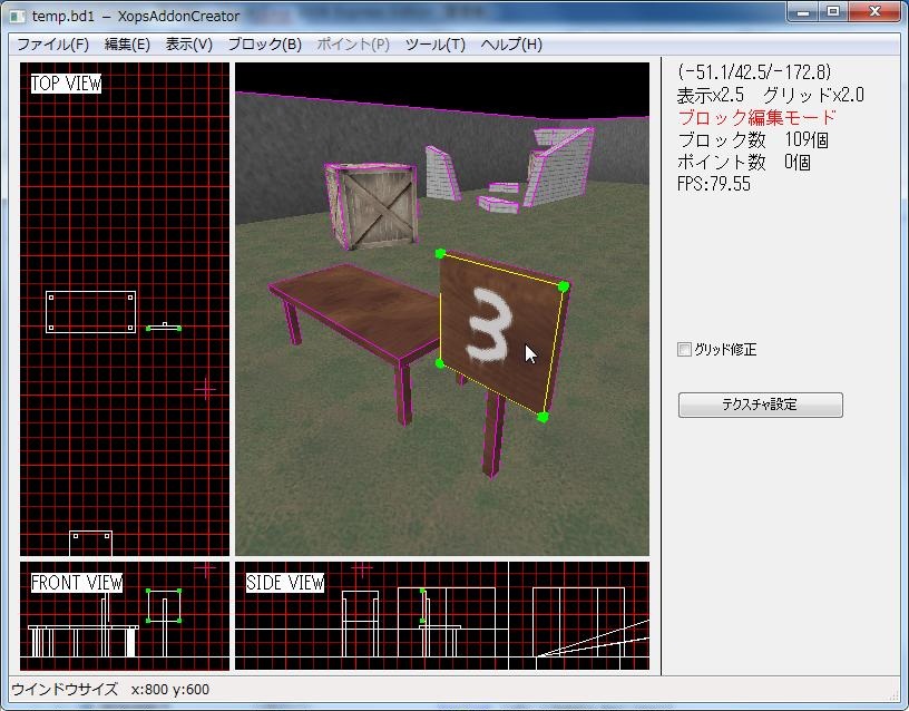 前回に書いていて気が付いたのですが、今年10月中に一切開発が進んでいなかったのは、 同月下旬に行われた某資格試験を受けるために勉強していたためです。 ブロック編集機能を実装中です。 ブロックデータファイルから参照した既存データの 頂点を移動したり、ブロックの削除やコピー andペースト(貼り付け)ができるようになりました。 後は、ブロックの新規作成や、テクスチャの設定(番号とUV座標)が出来るようにします。 ブロックの新規作成もポイントと同様に、ダイアログを出すインターフェースにする予定です。 OKボタン(ショートカットキー・Enter)を押す操作が増えますが、公式ソフトウェアのように 「大・小」以外にも大きさを指定して配置できます。 問題はテクスチャの設定です。いまだにどのようにするか決まっていません。 前回書き忘れましたが、ブロック・ポイント両方ともコピーandペーストが行えます。 現行のポイントエディタ・XPE+と異なりコピーできるデータの上限数はありません。 またWindows標準のクリップボードを使用しているため、他のXopsAddonCreatorや ソフトウェア終了後でもペーストできます。 <追記> 前回の記事にSecretでコメントをしてくださった方、応援メッセージありがとうございます。
